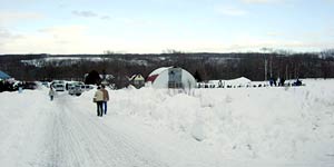 カメラマンが列を作る。観光バスも多く立ち寄り,いちばん活気のあるタンチョウスポットである。ここはもともと下雪裡小学校のあった場所で,先生と子供たちが給餌活動を始め,小学校の廃校後は渡部トメさんが給餌を引き継いでいる。渡部トメさんは紅白歌合戦の審査員になったり,NHKの方言の番組に出たりと大変有名な方である。
