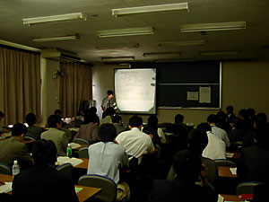 学会というのは,学術講演会がメインで,このようにOHPを使って研究成果を発表するのである。1人当たり,発表6分,質疑討論2分という非常に短い時間だが,その道の権威の前で話すことができる貴重な機会である。