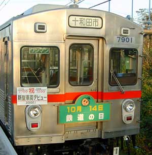 「新型車両デビュー」のステッカーと「鉄道の日」のヘッドマークを掲出。しかしこの新型車両は東急から移籍してきたもので,昭和40年前後に製造された車両を改造したずいぶん年をくった新型車両なのである。