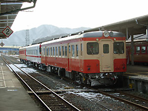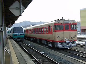 ちょうどキハ58形Kenjiが釜石に向けて発車するところだった。隣は一ノ関から乗ってきた車両で,先に回送されて宮古に到着していた。三陸海岸へ向けては一ノ関から「初日の出釜石号」が,盛岡から「初日の出宮古号」が運転されたが,それぞれ釜石−宮古間を回送されて,帰りは車両が入れ替わる。つまり,行きに「初日の出釜石号」,帰りに「初日の出宮古号」に乗れば結局同じ車両(国鉄色キハ58)に乗ることになる。
