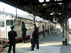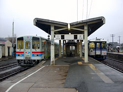 郡家(こおげ)駅にて。ここから若桜(わかさ)鉄道(もとのJR若桜線)が分岐している。