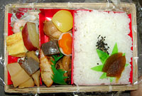 鳥取駅で購入してあった「鳥取三十二万石弁当」を開ける。この弁当は失敗だった。駅弁を買うときは荷物にならないように,なるべく包み紙だけ残して箱は捨てられるものを選ぶのだが,この弁当箱は竹で編んだ立派なもので,捨てるわけにいかなかった。仕方がないので弁当箱の中に電池の充電器やカロリーメイトなど詰め込んでなるべくかさばらないようにして,リュックに詰めた。