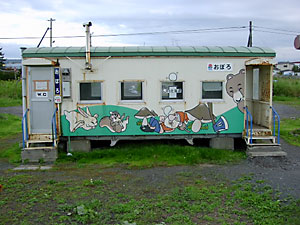 滝川から根室本線を走ってきて,初めての貨車駅である。花咲線の貨車駅舎は昭和61年に設置されたものでそれぞれかわいらしい絵が描いてあるので,貨車駅の味気なさがいくぶん薄らいである。