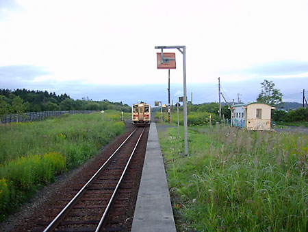 線路脇は林で,林の向こう側にはひたすら牧草地が広がっている。しかし農家はほとんど見えない。国道44号に近づいてやや賑やかになってくると尾幌到着。