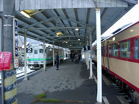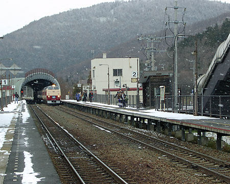 スーパーとかち6号と交換。ホームがずいぶん賑わっているように見えるが,思ったほどでもない。このツアーは最少催行人員80名とのことだが,80名に達していなさそうだった。私はこのスーパーとかち6号で占冠に向かった。