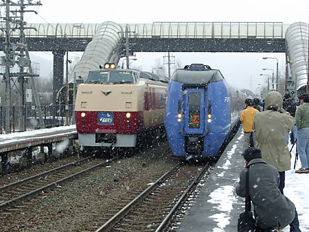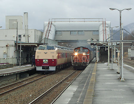 | キハ183系4両編成。トマム到着時はなぜか「おおぞら」のヘッドマークを掲出していた。この列車は釧路行きではない。 | |