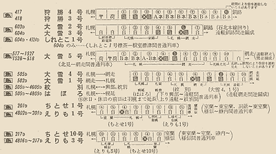 急行列車編成表の一部。この当時特急列車はまだ少なく,急行列車が幅を利かせていた時代だった。キハ56・27・22などを使用した気動車急行のほか,夜行列車は客車で運行されており,寝台車にはオロネ10,オロハネ10,スハネ16など10系客車が使用されていたようである。