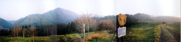 看板のあるところは360度のパノラマがきく展望スポットであり,四方を山に囲まれたニニウを実感することができる。
