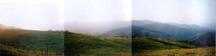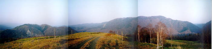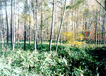 | ニニウの山はおよそ原始林とはほど遠い。写真のように笹の原に細い木が茂っている。これは,明治以来1度か2度は焼かれて畑にされたり,木材用に伐採された証拠である。 決して美しい森とはいえないが,開拓跡地の寂しい雰囲気が漂う。こんなところにも鹿はたくさんいるし,熊の気配さえ感じる。 自然のままに原始の森に還るのを待つのもいいが,これでも人の手を入れれば感じの良い森になるはず。日本全国でも失われつつある「里山」の風景をニニウにつくることができたらいいなあと思う。 |