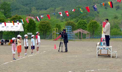 この校長先生,白のジャケット姿がいかにも山の学校の校長先生という感じがして好ましい。しかし,赴任してから今年で3年目,過去の2回の運動会はいずれも雨に見舞われ,「雨ふり校長」と呼ばれているそうである。