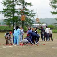 ついに登場,小さな学校ならではの地域住民参加の競技。人数が集まらないようで,「オンナタンナイ,あと3人!」,我は観戦と決め込んでいたおばさんも「オイ,レーコ,ナステンダー,早く早く」とせかされて腰を上げる。その後さらに「あと男性5人お願いします」と私も危うく駆り出されそうになったので,そっと木陰に引っ込む。