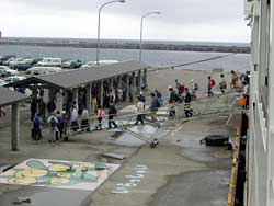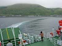 8時15分,香深港到着。船は座る場所もないくらいの満員だった。しかし今年は桃岩ユースホステルが休業中のため派手なお迎えはなく,乗客も若い人が少なかった。