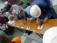 | 若い2人は石段を駆け上がる。 | そしてまたけんかが始まる。 | 神主さんはこれから祭りに向かうところ。 |