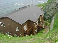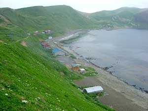 車で行けるところとしては礼文の最奥地と思われる。番屋風の建物が何軒かあり,ひっそりとした集落だった。しかし人が住んでいる気配はしなかった。礼文島の西海岸にはこのほかに召国や宇遠内など車道の通じていない集落がある。