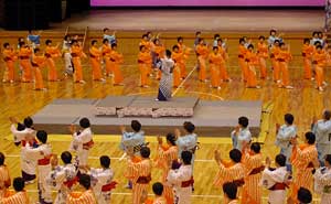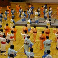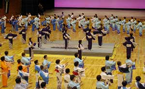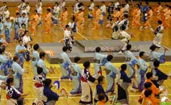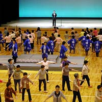 鳥取県の鹿野さんこ踊り。これはあまり知られていないようで,地元の先生による3分講習があった。さすがに先生方は覚えも早い。やはり基本的な所作は共通するものがあるのだろう。道外からの参加者はゲスト程度の人数かと思ったが,約400名の参加者のほとんどが道外から来ているようだ。鳥取からは123名も来ているとのこと。