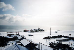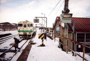 | 五稜郭で乗ったときには5両編成だった列車も,途中でどんどん切り離されて,1両編成になって黒岩駅に到着。 | 単調な噴火湾沿いの海岸にあって,珍しい奇岩・黒岩。雪のため近づけませんでした。 |