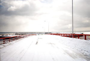 | ワイングラス形の国縫漁港。同行のれんがもち氏は港湾の専門家。日本で数少ない,成功している港湾だそうです。 | 旧瀬棚線が分岐していた国縫駅。非常に味のある跨線橋が残っています。 |