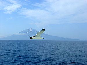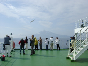 利尻富士が見えた。エサをねだりにゴメさんがやってくる。いよいよ島へ渡るんだという実感が沸いてくる。