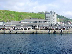 香深港入港。すごい賑わい。右手の立派な建物はホテル礼文。離島にもこんな立派な建物があるんだ。