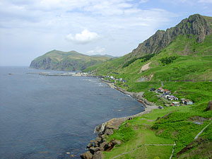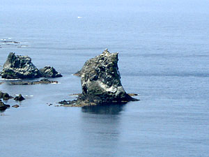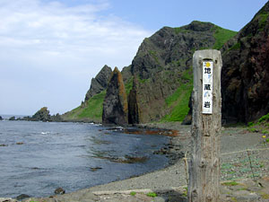 礼文町のカントリーサインにもなっている地蔵岩。写真中央の切り立った岩。高さは50メートルもあるという。かつてはここが西海岸8時間コースの終点だったが,現在はこの先宇遠内まで落石の恐れがあるため通行できないようだ。