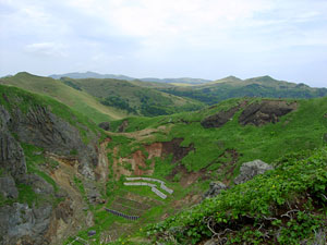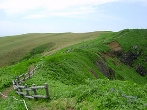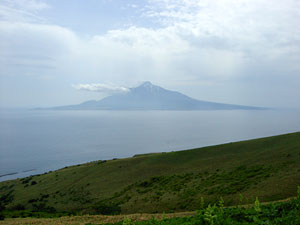 | 桃岩展望台から見る利尻富士。礼文から見える利尻富士は姿が美しく,好きな人が多いという。 | 桃岩展望台から北側を望む。なだらかでありながら人を寄せつけない丘陵がどこまでも続く。 |