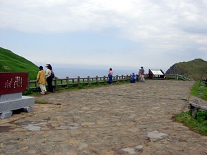 | 画面に収まりきらないほど眼前に迫る桃岩。車道とは別に遊歩道があって,歩いている人がたくさん見えた。今度はフェリーターミナルから歩いてきてみたい。 | |