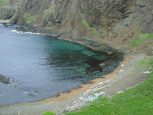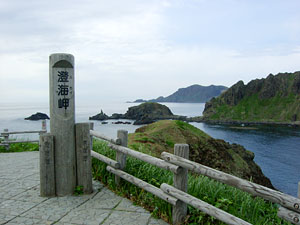 礼文の海は透明度が高いといわれるが,それがいちばん感じられるのがここ。岬から見下ろすと,青く透き通った水に白い海の底が映えて美しい。沖縄の海のようでもある。