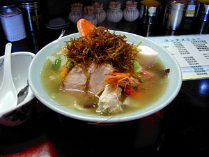 見てのとおり海の幸が山盛りだ。まずでっかいカニの足をどけ,貝殻ごと入っているホタテを片付けて,それからじゃないと麺が出てこない。さめた人なら「食べにくいな」の一言で片付けてしまうだろう。しかし確かに食べにくいがそれ以上に味がいい。あっさり塩味ながらスープにはしっかりダシがしみこんでいる。店は観光客で混んでいて,バイトのお兄さん方は不慣れな対応だったが,店長自らおしぼりをもってきてくれたのには恐れ入った。