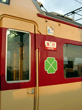 | 中沢駅に停車中。蟹田まで貨物列車との交換待ちが何度もあった。6両編成だが,途中駅でも全部ホームにかかっていたのはすごい。乗客は朝帰りの若者が多いようだった。 | 6号車は半室グリーン車。なぜか「急行」の表示。 |