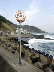 瀬田来バス停から函館行きのバスに乗車。荒天の日なら波しぶきをかぶりそうなバス停だ。