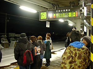 水沢22時48分発下り最終列車を待つ。今日はこの後も初詣列車として「夢絵巻開運義経号」が運転されるが,中尊寺で新年を迎えるならこの列車が良いだろう。なかなかの賑わいで,高校生や専門学校生が多くを占めているようだ。みな楽しそうな表情をしており,わたしもわくわくしてきた。