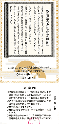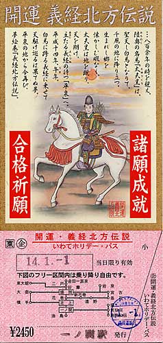 さっそく「開運・義経北方伝説いわてホリデーバス」を購入。今回はこの切符を使いたいがために,あえて安くつく青春18きっぷを買わなかったのである。「このきっぷが心の支えとなれば幸いです。」とある。