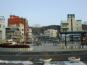 | メルヘンチックな色合いの駅舎 | 意外と都会的な駅前風景 |