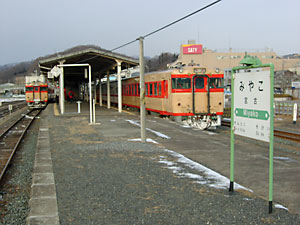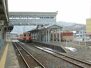 ちょうどキハ58形Kenjiが釜石に向けて発車するところだった。隣は一ノ関から乗ってきた車両で,先に回送されて宮古に到着していた。三陸海岸へ向けては一ノ関から「初日の出釜石号」が,盛岡から「初日の出宮古号」が運転されたが,それぞれ釜石−宮古間を回送されて,帰りは車両が入れ替わる。つまり,行きに「初日の出釜石号」,帰りに「初日の出宮古号」に乗れば結局同じ車両(国鉄色キハ58)に乗ることになる。