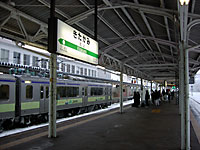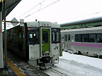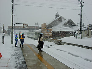 14時36分発北上行き列車を待つ。べたべたの雪が降ってきた。今日は盛岡を出て以来,ダイヤが乱れ気味である。保線の人が心配そうに見ている。元旦からご苦労様だ。