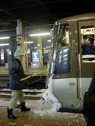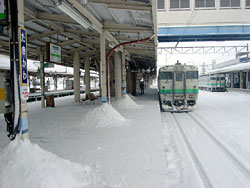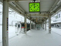 旭川直通の快速エアポートは785系特急車両で運転される。札幌で進行方向が変わるので,前面の雪を落としていた。帰省ラッシュといっても,混雑には波があるようで,この列車は空いていた。