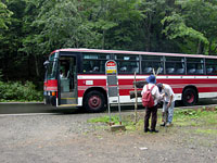 鶴の湯入口で1組の夫婦が降りようとした。すると運転士さんは「ここからはかなり距離がありますよ。旧道口から歩いたほうが近いですよ。山道ですが道はついてます」と助言していた。どうやら旧道口から行けそうである。その夫婦と一緒に旧道口でバスを降りた。