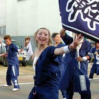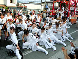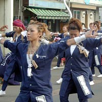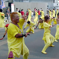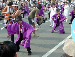 しかし,若い人はそれなりにさまになっており,衣装も年配者よりむしろシンプルである。踊りはパレード形式に踊り続けるのではなく,場所を移動しながら一定の時間を空けて,曲のスタートと共に踊りを開始する。踊りは極めて激しく,踊っている間ずっと全力疾走をしているのと同じくらい体力を消耗しそうだ。一昨日見た一日市の三勝踊りも体力を使いそうだったが,それとは比較にならないくらい激しい。しかも動きはピタリとそろっており,これはそうとう稽古を積んでいると思われる。