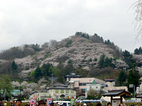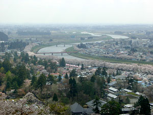 古城山中腹からの眺め。これは絶景。桧木内川の桜並木がよく見える。