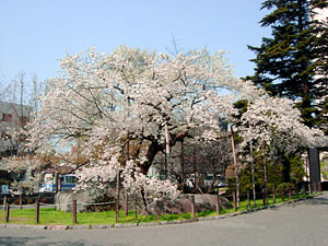 裁判所の前にある巨木で,樹齢350年といわれる。大正11年に国の天然記念物に指定されている。エドヒガンというこの種の桜は自生種であり樹齢が長い。また自生種でありながら,ヤマザクラとは異なり葉が出る前に花を咲かせる。