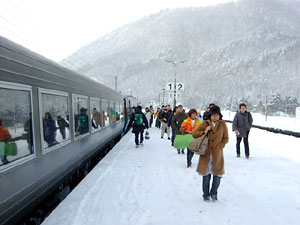13時1分発夕張行き列車に乗る。この列車は札幌から普通列車で来る場合のいちばん早い列車であるにもかかわらず,映画祭関係の客は数名しか乗っていなかった。