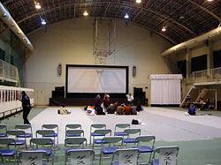 このあと上映まで30分ほどの間にもうすこし観客は増えたが,95%は地元のおじいさん,おばあさん,おじさん,おばさんだった。映画祭は市民から遠い存在になってしまっていると懸念する意見もあるようだが,ここで見る限りは市民は地域のお祭りとして映画祭に参加しているようだ。体育館の一角では清水沢商店街の人たちが炊き出しをやっていた。