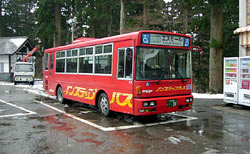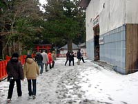 これは好都合。団体客に混じってガイドさんの説明を聞かせてもらおうと思ったが,ガイドさんは「はーい,これが出羽三山神社でーす。三つの神社を祭っているので,額が三つありまーす。」と極めてやる気なし。団体客も障子を開けようともせず,パンパンと手を叩いてちょこんと頭を下げてそそくさと出て行く。