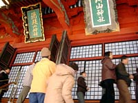 すると驚き,内部にはまったく別世界があった。白衣に赤い袴を身にまとった巫女さんがずらりと並び,御守や神札を授与していた。
