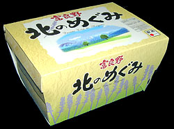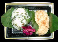 北のめぐみ,1000円,2002.9.11購入 ★★★★★2段重ねの弁当で,下段には本物の笹の葉に包まれた大きなおにぎりが2つ入っている。上段にはおかず満載で,半分に切ったじゃがいもがまるごと入っているのは駅弁では珍しいし,ラム肉用の特製のタレがついているのは手がこんでいる。とにかくおにぎりが大きいので量は十分すぎるくらいで,小食の人なら1箱で2人分くらいありそうだ。*2003年は販売中止。 |