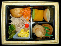ふらのとんとろ丼,980円,2003.8.10購入 ★★★★豚の産地,富良野らしい駅弁。半熟卵を載せて食べる。本当は生卵にしたかったのだろうが,汽車の中で生卵を割ってひっくり返すと手に負えなくなるので半熟にしたのだろう。小瓶にはコチュジャンソースが入っているが,これは何につけるのだろうか。容器が本物の木であるというのは嬉しい。 |