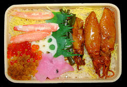 海女弁当,1050円,2002.12.29購入 ★★★★★うに,はらこ,蟹,いかなど海産物がギュっと詰め込まれており大変おいしい |