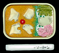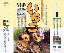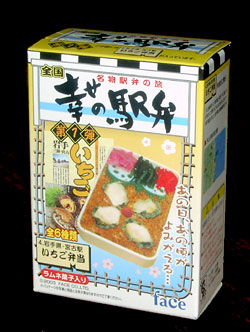いちご弁当,1150円,1998.12.12購入 ★★★★★三陸の郷土料理である「いちご煮」は,ウニとアワビだけで作られたお吸い物で,汁の中のウニが野いちごのように見えることからそう呼ばれている。ウニとアワビがたっぷり入ってこんなに安くて良いのだろうか。右の写真は本物ではなく,2003年1月に(株)フェイスから発売された駅弁フィギュアである。 ![]() |