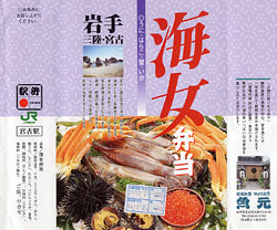 調整元は「漁場料理 炉ばた割烹・魚元」。昭和58年創業の料亭で,駅弁販売開始も平成元年と比較的新しい。価格は高めだが,料亭が作っているというだけあって,値段以上に付加価値がついたような高級感がある。宮古駅外側のキヨスクで売っているが,数が少ないため売り切れることもある。また盛岡駅でも販売している。