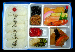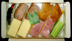 洋寿し,650円,2003.2.19購入 ★★★★名物駅弁。ネタはきゅうり,ハム,カツ,焼き豚,チーズ,しゃりにはわさびではなくからしが入っており,醤油の代わりにソースをつけて食べる。徹底的に洋風にこだわった寿司である。これが意外においしい。値段は安いがにぎりが大きいので,普通の駅弁よりおなかが膨らむ。 |